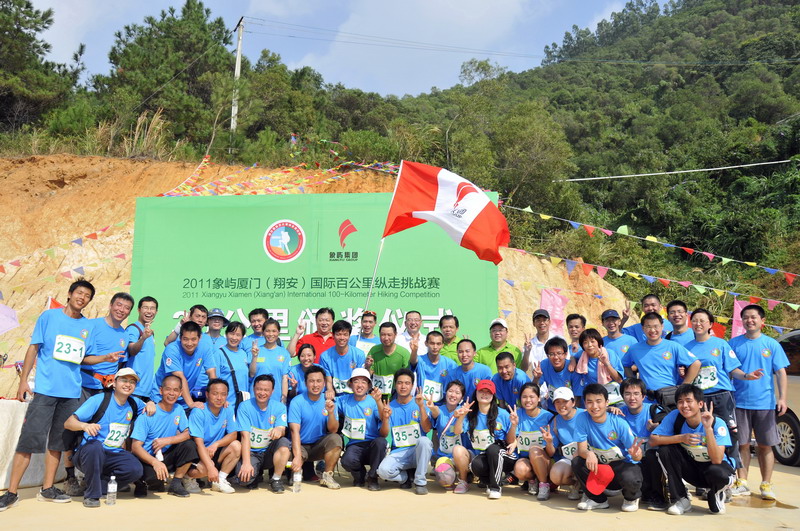 11月5日8時(shí)09分,明媚秋光里,廈門市委常委、副市長臧杰斌宣布2011象嶼廈門(翔安)國際百公里縱走挑戰(zhàn)賽開始,廈門市人大常委會(huì)副主任黃杰成、廈門市政協(xié)副主席陳昌生、國家奧林匹克體育中心副主任彭維勇、象嶼集團(tuán)總裁張水利等一起為比賽鳴槍。來自28個(gè)國家和地區(qū)的近萬名運(yùn)動(dòng)愛好者,從大嶝小鎮(zhèn)·臺(tái)灣免稅公園廣場(chǎng)出發(fā),穿越田野、海濱、山巒、閩南古厝,開始了一段挑戰(zhàn)自我的征途。這其中,由象嶼集團(tuán)員工及家屬、合作伙伴、共建單位等組成的千人象嶼團(tuán)隊(duì)分外引人注目,浩浩蕩蕩的象嶼人走在一起、樂在一起,在欣賞沿途自然、人文風(fēng)光的同時(shí),也享受著挑戰(zhàn)自我、永不止步的健康向上,享受著與同事、親朋共度美好秋假的怡然歡樂。
