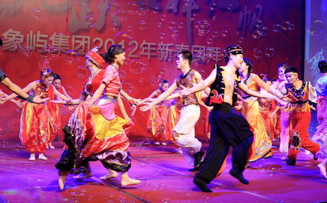 團(tuán)拜會(huì)上,象嶼人自編自導(dǎo)自演的春晚節(jié)目盛大登場(chǎng)。象嶼建設(shè)集團(tuán)獻(xiàn)演的歡慶歌舞《盛世中華》,身著民族節(jié)慶服飾的姑娘小伙們熱情奔放,氣勢(shì)恢弘;象嶼股份火辣的阿拉伯舞《美麗的姑娘賽比古兒》驚艷全場(chǎng),扭轉(zhuǎn),抖肩,甩胯,窈窕的姑娘們盡情地綻放著耀眼的青春;上海區(qū)域選送京劇《智斗》,叱咤上海灘的各位公司高管齊登戲臺(tái),無(wú)論是司令還是阿慶嫂,范兒倍足,調(diào)兒倍正,十足個(gè)性演繹,引發(fā)臺(tái)下叫好不斷;集團(tuán)公司聯(lián)合象嶼資產(chǎn)、象嶼配送、象嶼碼頭、象嶼建設(shè)表演的歌舞聯(lián)唱《歲月如歌》,高中基三級(jí)同臺(tái),老中青三代盡歡,不同風(fēng)格的歌舞串聯(lián),展現(xiàn)的是象嶼文化的包容與開(kāi)創(chuàng);福建/南平象嶼公司逗趣的《小人舞》創(chuàng)意無(wú)限,傳神的表情映襯恰到好處的肢體動(dòng)作,笑點(diǎn)不斷,而很難想象的是每個(gè)人物都由雙人搭配,紅幕后是團(tuán)隊(duì)配合的默契;速傳物流活潑優(yōu)美的新疆舞《掀起你的蓋頭來(lái)》充滿戲劇色彩,群舞韻律動(dòng)感,對(duì)舞火花擦撞,多情的青年男女追尋著炙熱的愛(ài)情,也寓意著象嶼人勇于追求心中美好的向往。春晚在晨帆合唱團(tuán)歡快的《陽(yáng)光進(jìn)行曲》中成功落下帷幕。團(tuán)拜會(huì)現(xiàn)場(chǎng)歡樂(lè)、祥和,晚宴期間穿插的抽獎(jiǎng)活動(dòng),更讓驚喜的歡呼尖叫聲接連不斷,公司為辛勤一年的員工們準(zhǔn)備的豐厚大禮,掀起現(xiàn)場(chǎng)一次又一次的高潮。