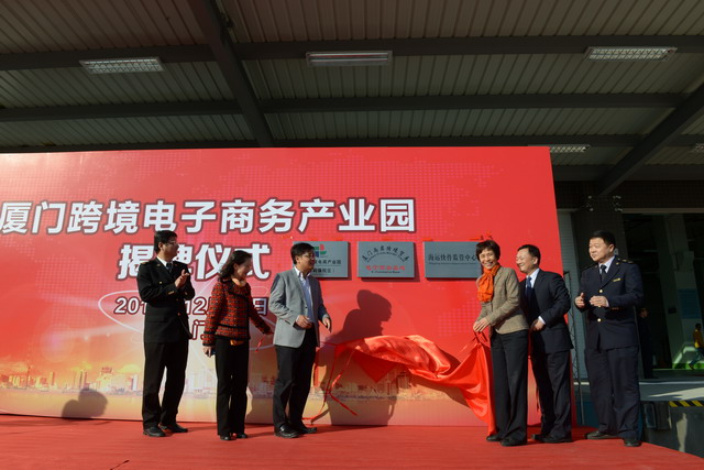 市委常委、統(tǒng)戰(zhàn)部部長黃菱,副市長張燦民為廈門跨境電子商務(wù)產(chǎn)業(yè)園揭牌,并見證了跨境電商出口第一單貨物上線測試。