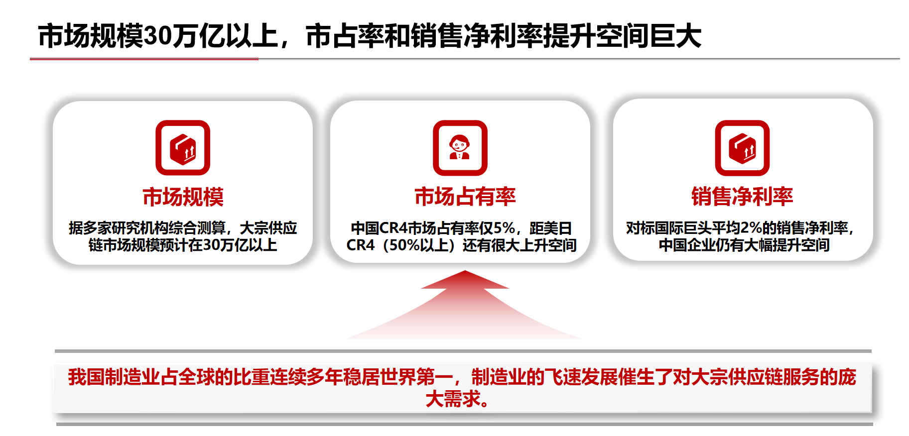 制造業(yè)企業(yè)日益專業(yè)化,對(duì)供應(yīng)鏈服務(wù)的需求從簡單追求成本,轉(zhuǎn)變?yōu)楦非笮剩袌?chǎng)亟需能提供“一攬子”服務(wù)、具備效率優(yōu)勢(shì)的大宗供應(yīng)鏈服務(wù)商。