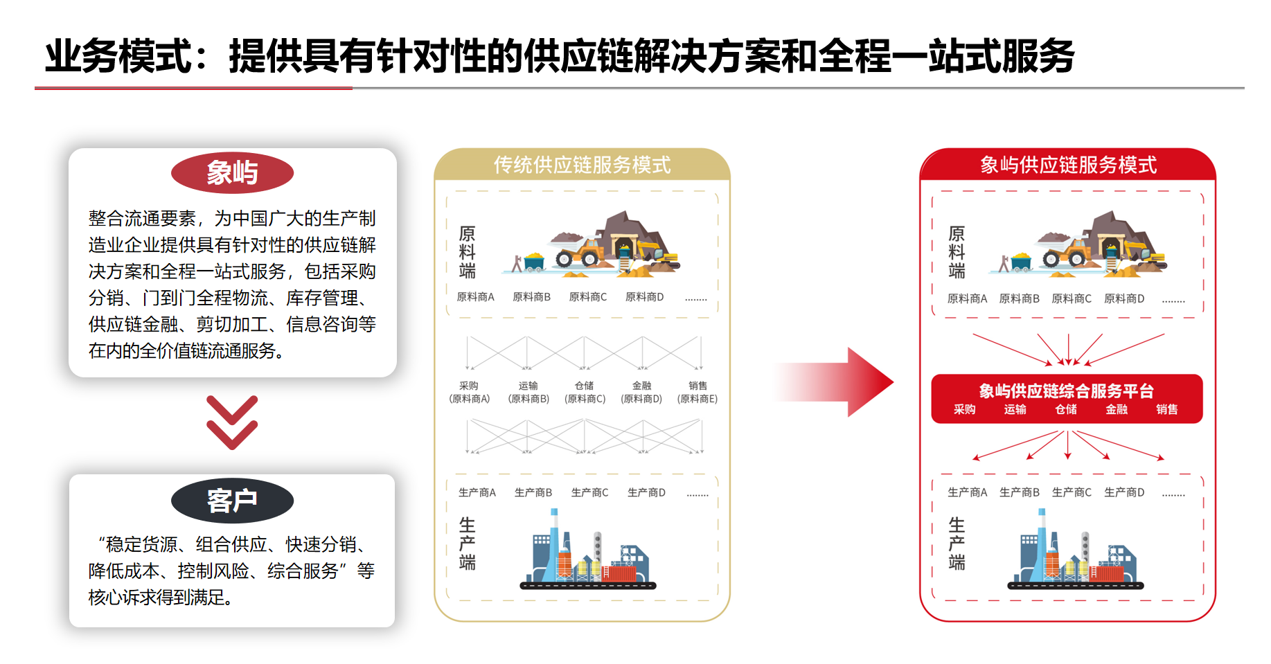 通過整合流通要素,為中國廣大的生產(chǎn)制造業(yè)企業(yè)提供具有針對(duì)性的供應(yīng)鏈解決方案和全程一站式服務(wù)。